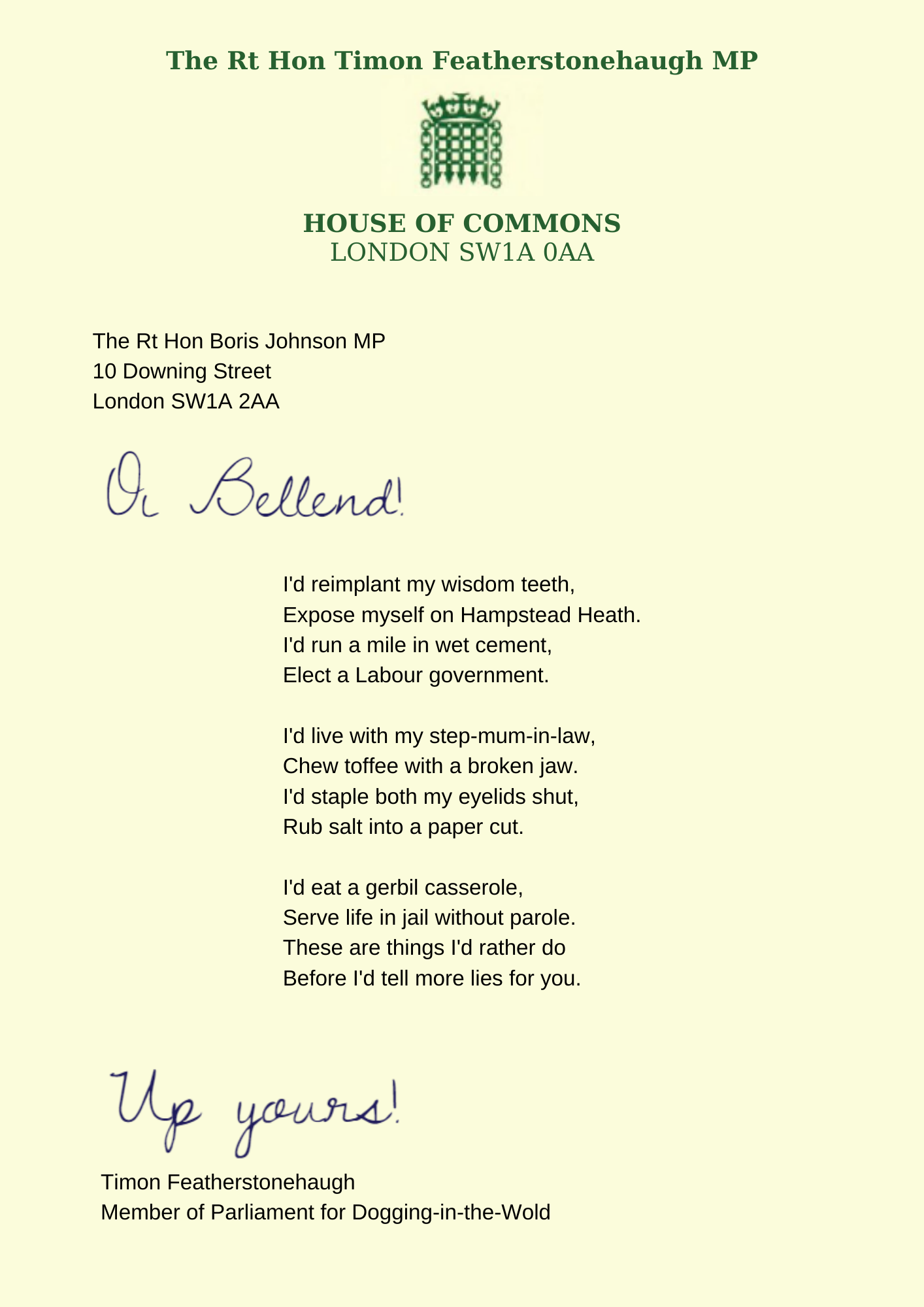 A leaked resignation letter from the (fictional) Rt Hon Timon Featherstonehaugh, MP for Dogging-in-the-Wold, explaining that he won't go out to lie for Boris anymore.