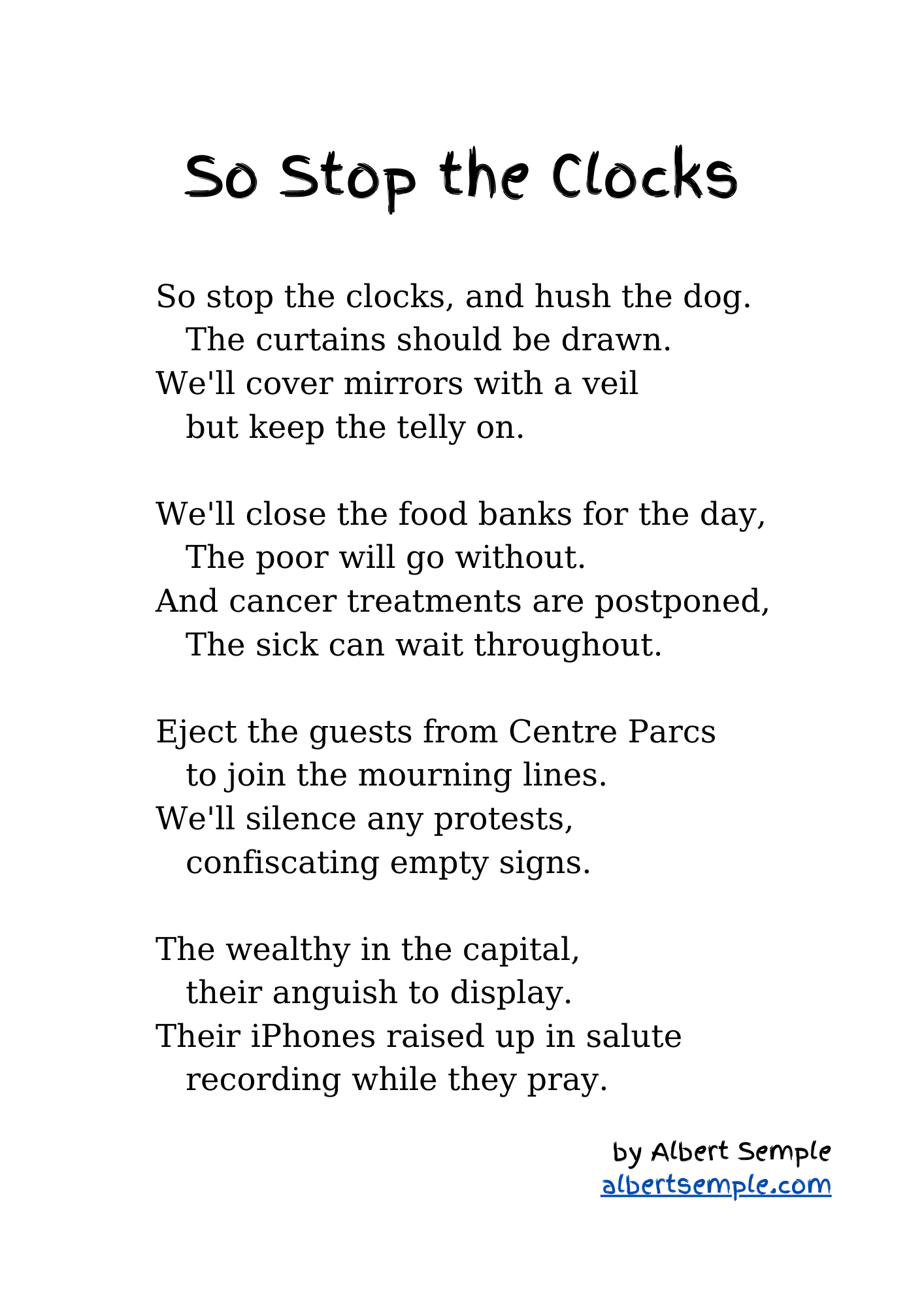 The title and opening of this poem are references to W. H. Auden's "Funeral Blues (Stop All the Clocks)"