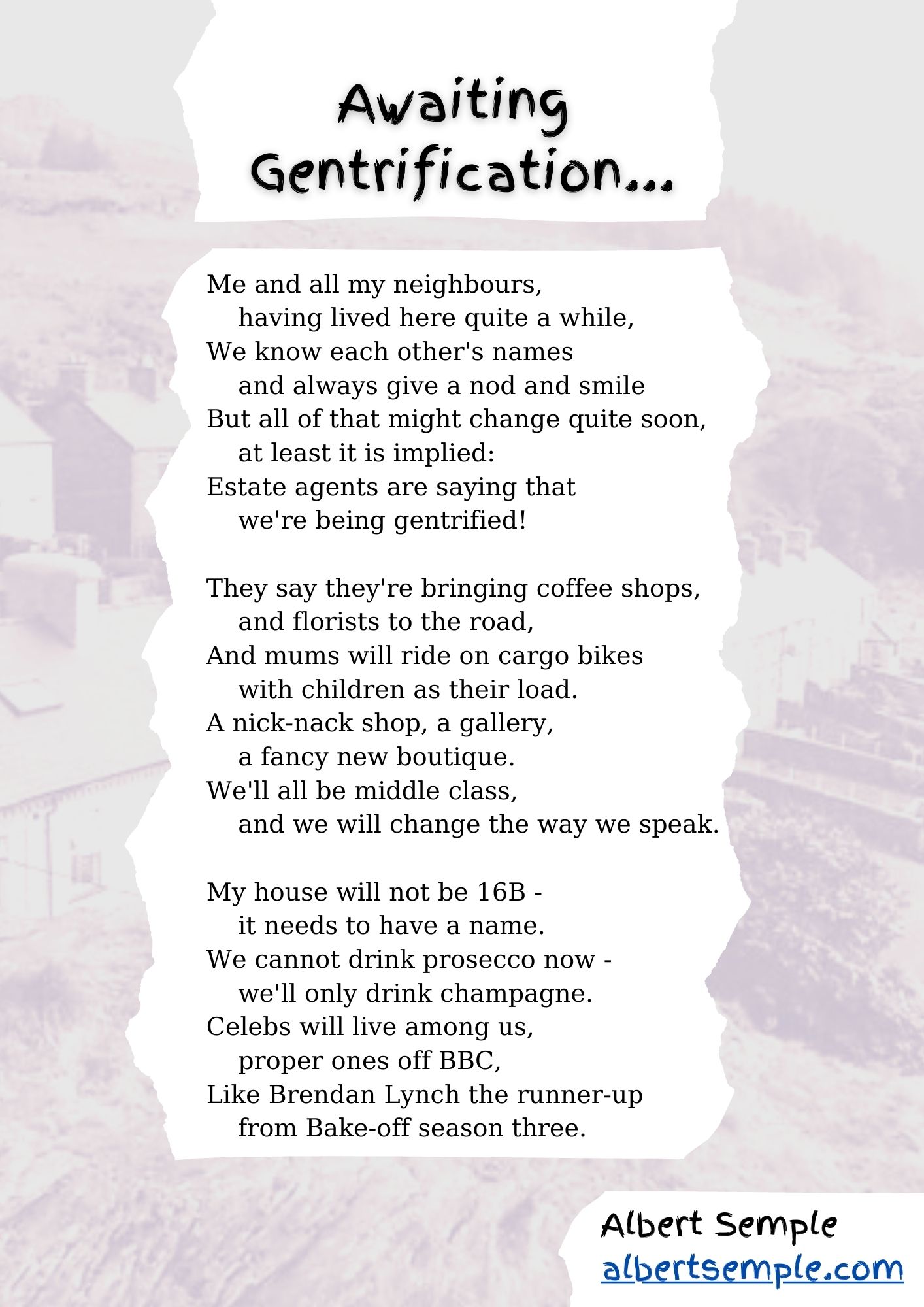 Here I've imagined a resident in an area which estate agents are saying (optimistically) is going to be "gentrified".