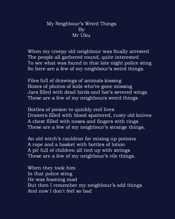 Another poem I spotted on social media that I had to ask the author if I could share. This one is by Mr Uku who seems to have the same obsession with rhyme and metre as myself, so I thought other blog readers would enjoy it too.