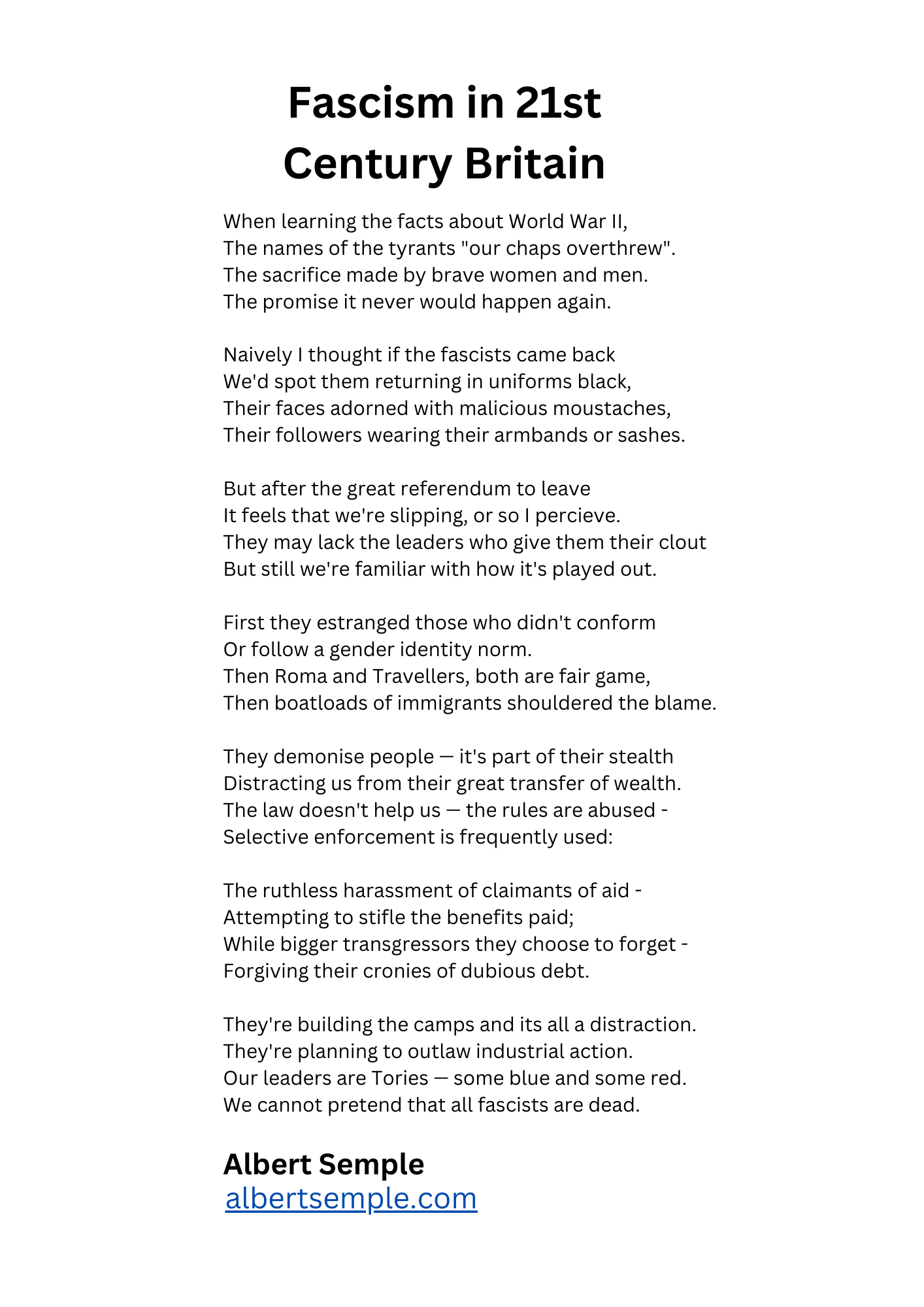 The final line reminds us that we still need to remain vigilant againt any rekindling of Fascism in the UK.