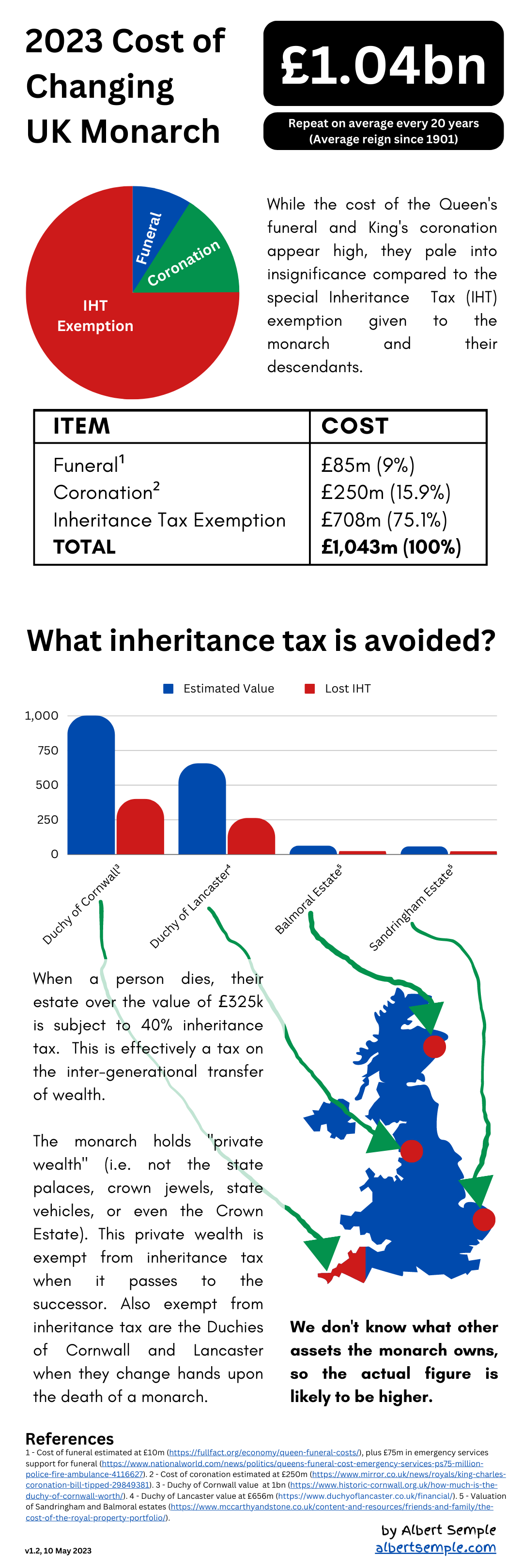 I prepared this infographic to show how the change of monarch from Queen Elizabeth II to King Charles III has cost the tax payer at least £1 billion pounds, with most of that cost being their special exemption from inheritance tax.