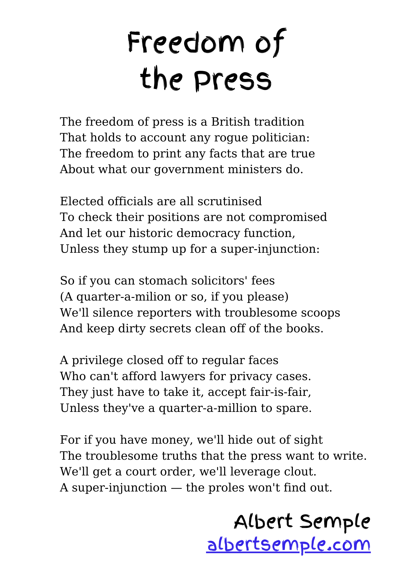 With the BBC news report that Tory donor Javad Marandi's "overseas interests had played a key role in an elaborate money-laundering scheme involving one of Azerbaijan's richest oligarchs" being revealed only after an 19 month injunction had been lifted, I thought it would be a good time to share this poem advertising services to the wealthy to avoid the pesky freedom of the press.