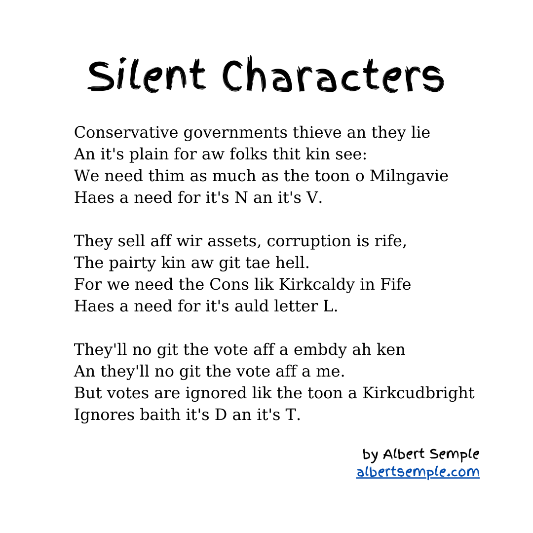 A poem with two topics. Firstly the popularity of the Tories in Scotland, and secondly the strange Scottish place names that aren't pronounced as they are spelt.