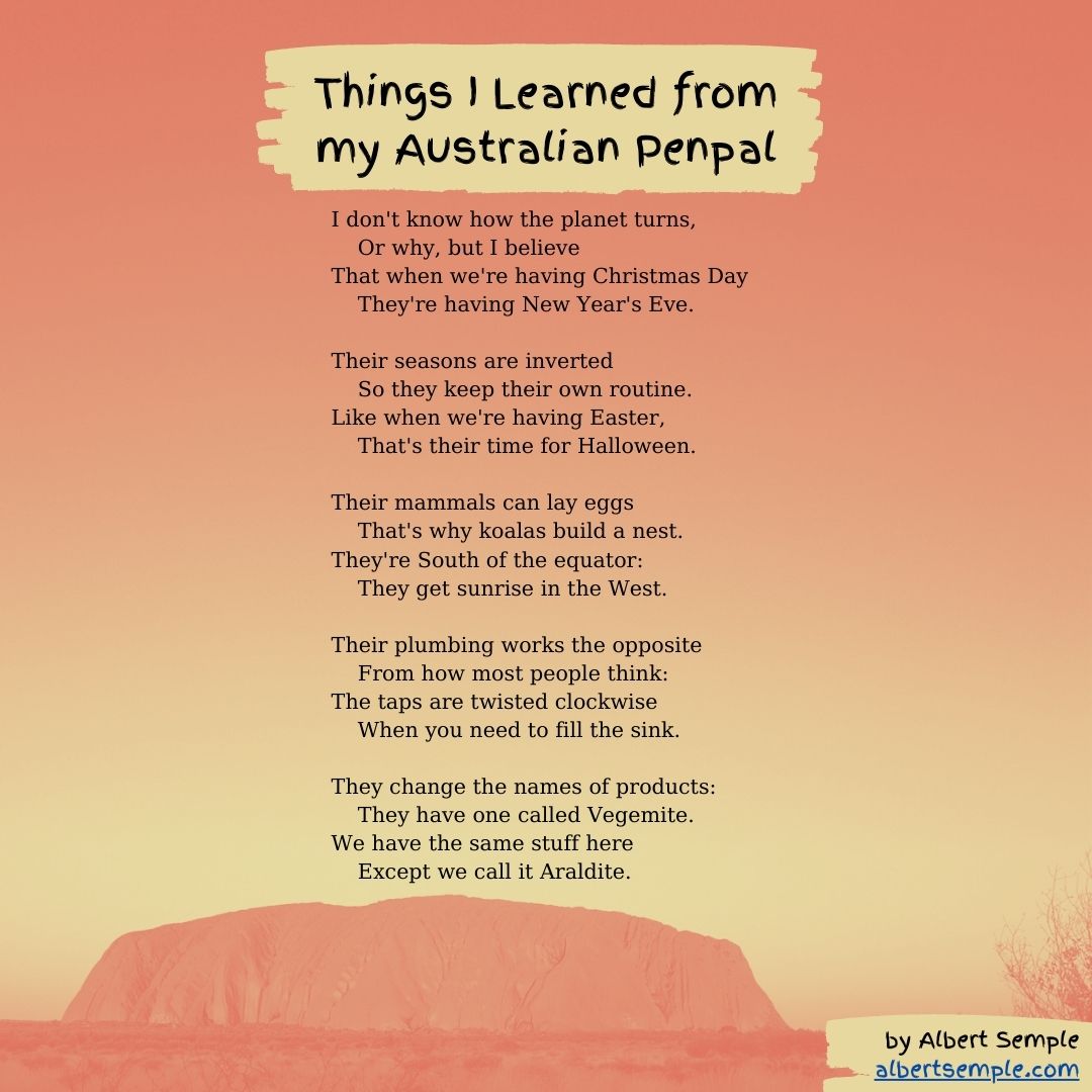 In this poem, I've documented some alternative facts about Australia. The "facts" come in pairs- — there is an intro that is factually true or at least plausible (e.g. they do have a mammal that lays eggs), followed by a punchline that aligns with the first statement but is false (e.g. the egg-laying mammal isn't the koala). So the narrator has picked up some true factual information, but corrupted it with detail that makes it false.