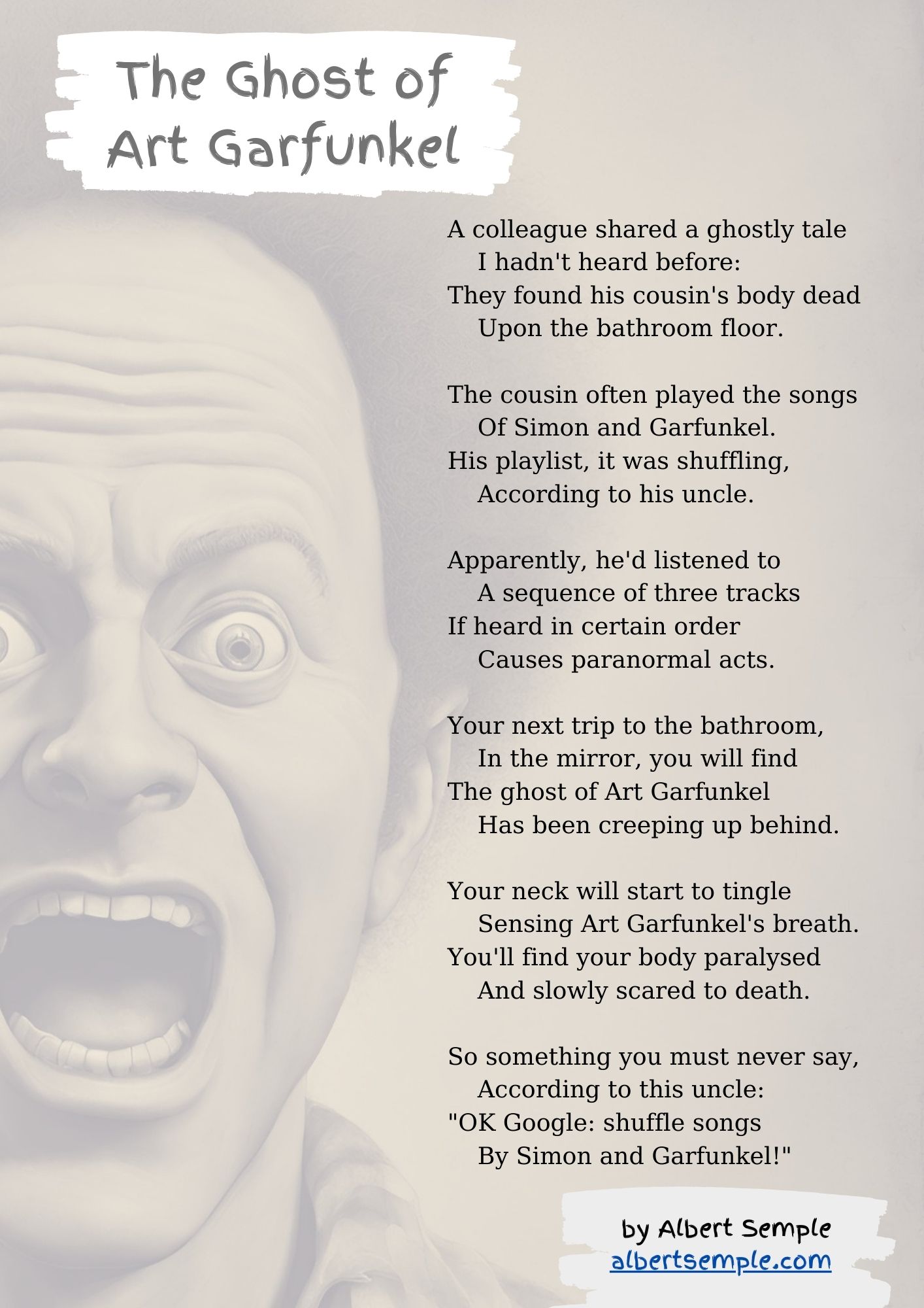 It's a spooky ghost story about the ghost of Art Garfunkel. Even though, at the time of writing, 82 year old Art is still living happily in New York, New York.